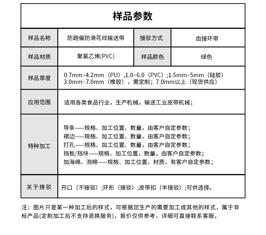 | 樣品名稱 | 防跑偏防滑花紋輸送帶 | 接駁方式 | 齒接環(huán)帶 |