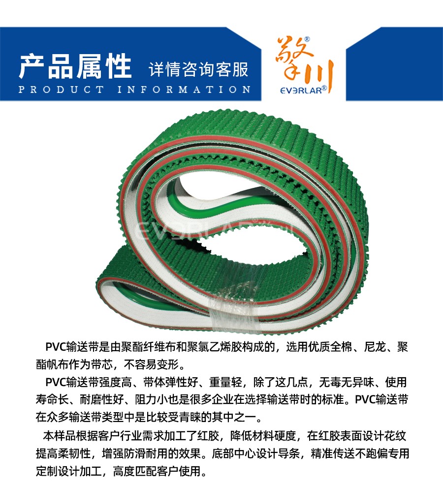PVC輸送帶是由聚酯纖維布和聚氯乙烯膠構(gòu)成的,選用優(yōu)質(zhì)全棉、尼龍、聚酯帆布作為帶芯,不容易變形。