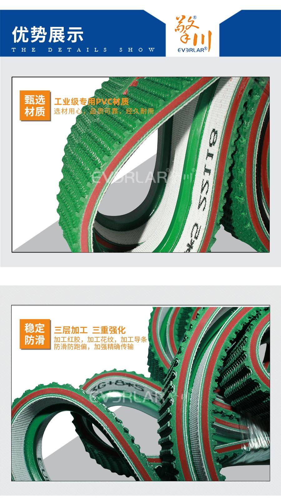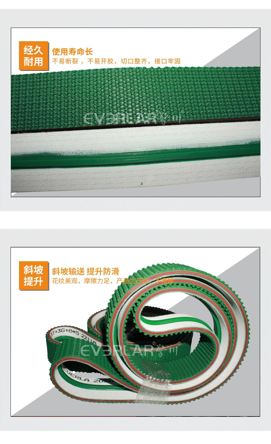 強(qiáng)度高,帶體彈性好,重量輕,無毒無異味,使用壽命長,耐磨性好,阻力小。