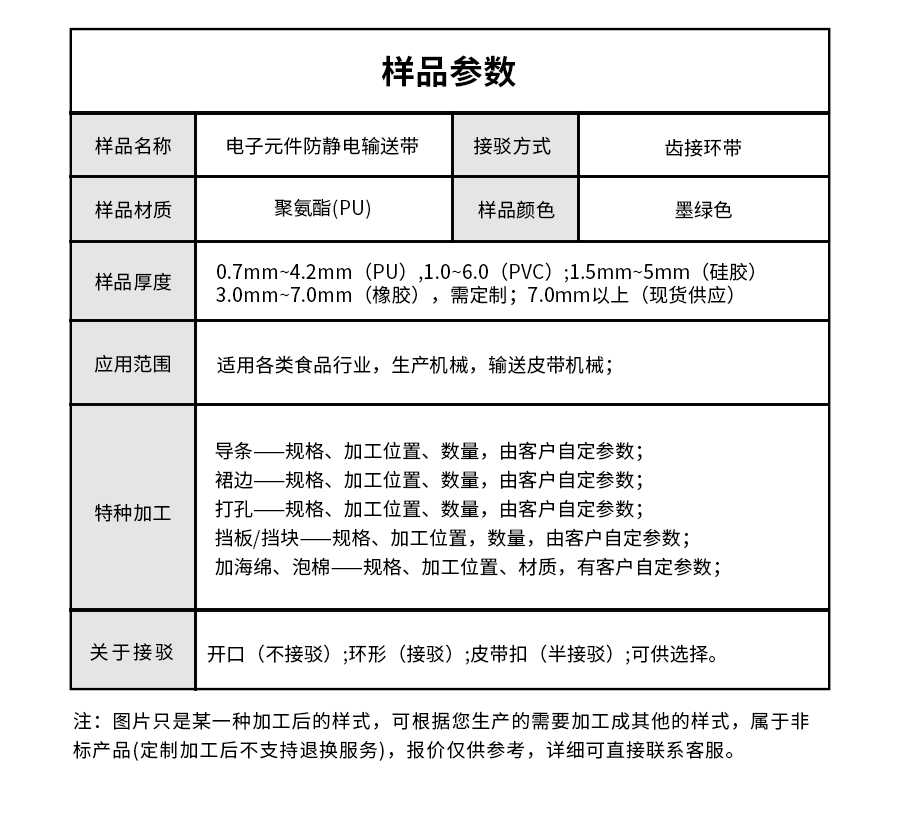 | 樣品名稱 | 電子元件防靜電PU輸送帶 | 接駁方式 | 齒接環(huán)帶 |