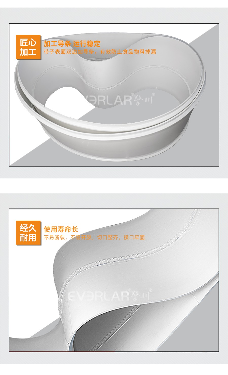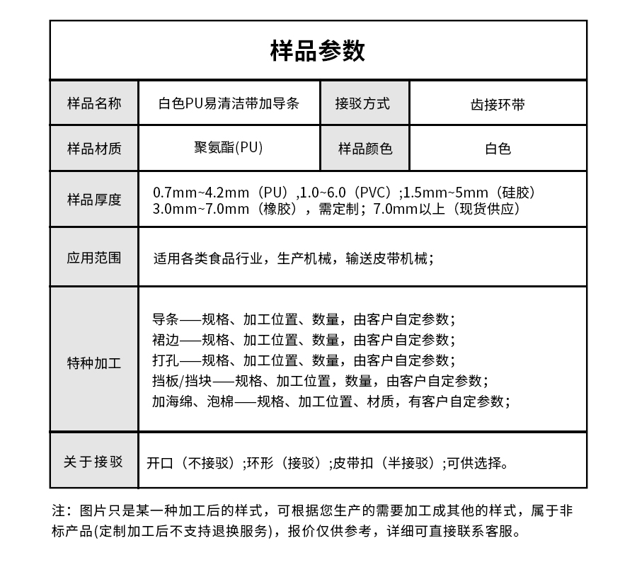 本樣品根據(jù)客戶行業(yè)需求加工定做,以PU輸送帶為底帶,以齒接環(huán)帶的接駁方式,加工導(dǎo)條,根據(jù)輸送帶特點(diǎn)命名為白色PU易清潔輸送帶。