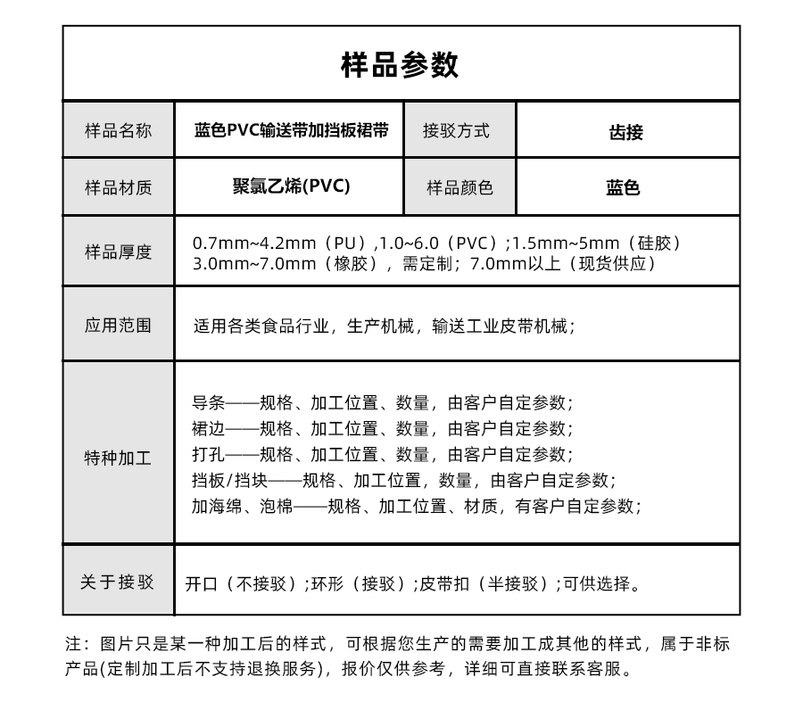 | 樣品名稱(chēng) | 藍(lán)色PVC輸送帶加擋板裙帶 | 加工方式 | 加擋板、加裙邊 |