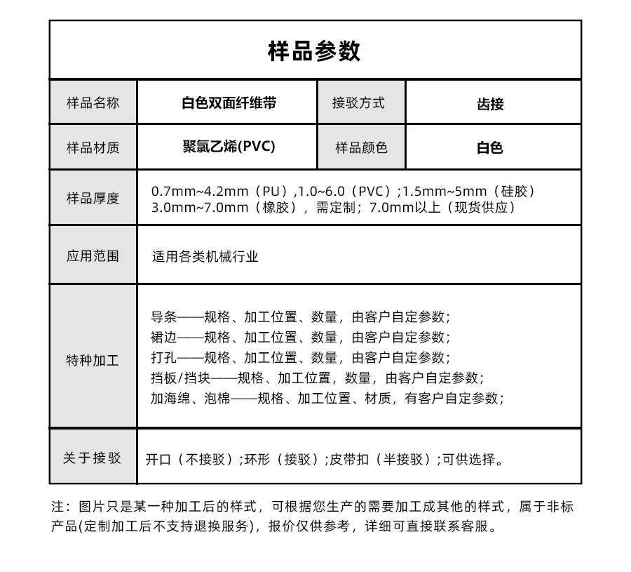 | 樣品名稱 | 白色PVC雙面纖維輸送帶 | 接駁方式 | 齒接環(huán)帶 |