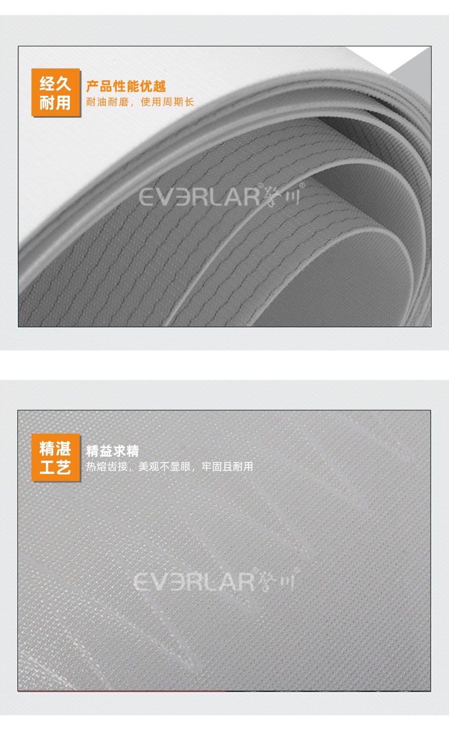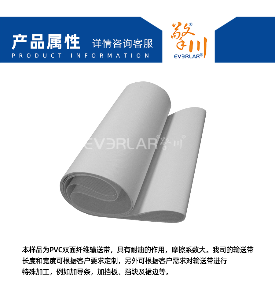 本樣品為PVC雙面纖維輸送帶,具有耐油的作用,摩擦系數(shù)大。我司的輸送帶長度和寬度可根據(jù)客戶要求定制,另外可根據(jù)客戶需求對輸送帶進行特殊加工,例如加導條,加擋板、擋塊及裙邊等。