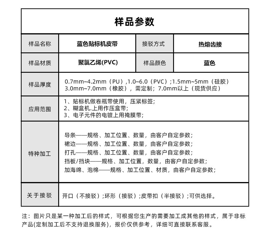 | 樣品名稱 | 藍(lán)色貼標(biāo)機(jī)皮帶 | 接駁方式 | 熱熔齒接 |