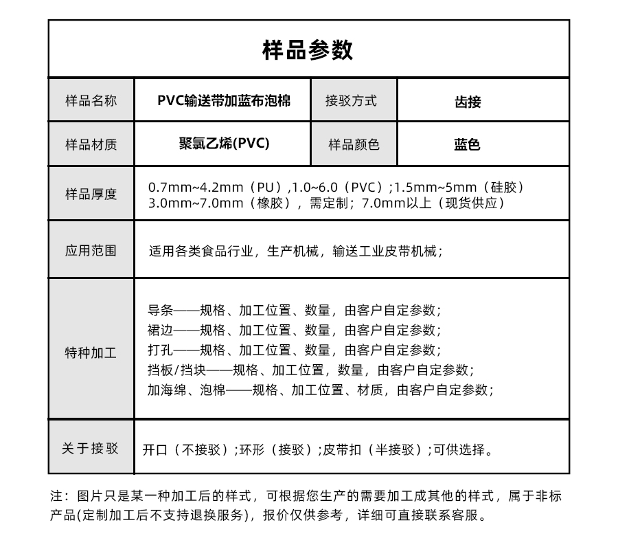 | 樣品名稱 | PVC輸送帶加藍布泡棉 | 加工方式 | 齒接 |