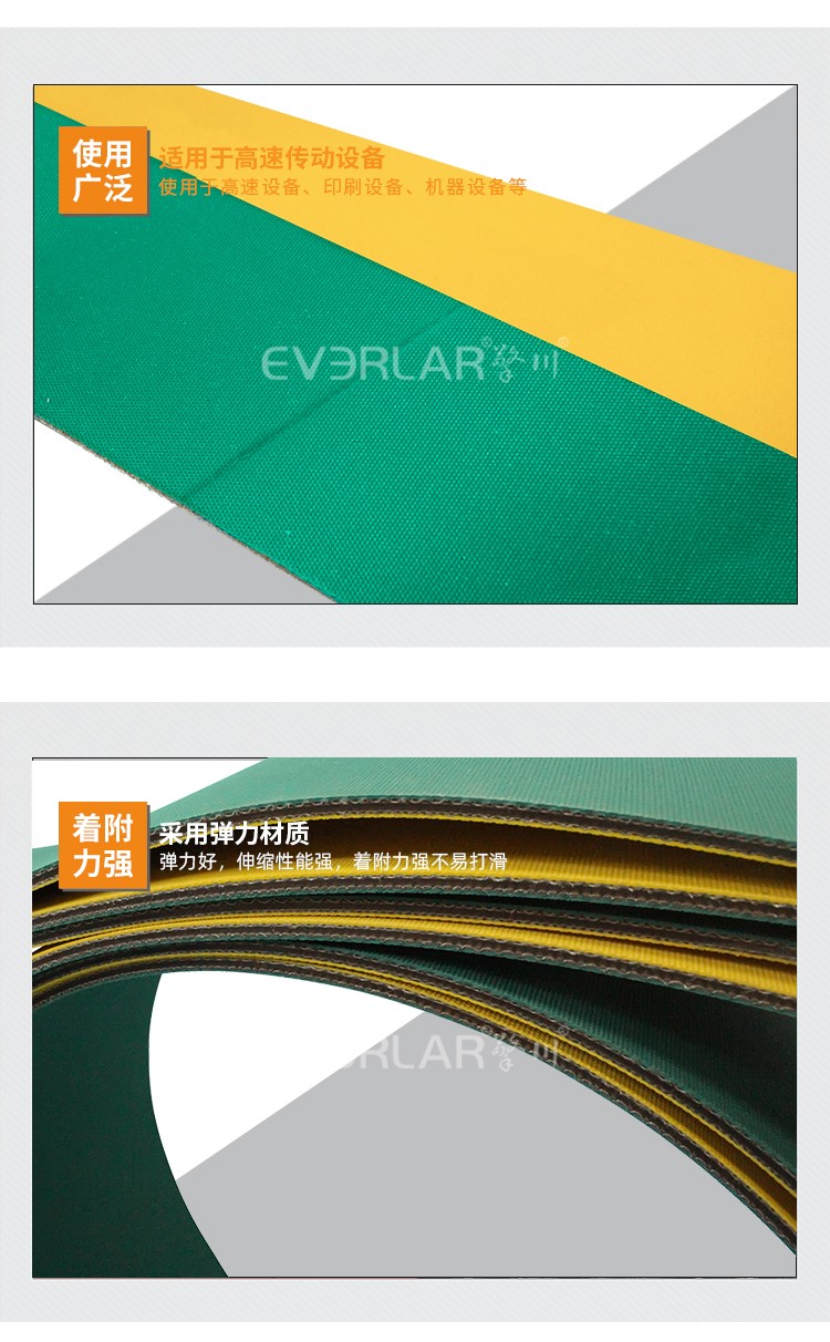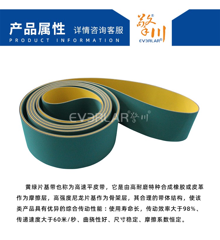 黃綠片基帶具有體質(zhì)量輕、強(qiáng)力高、使用伸長小、耐油耐磨性好、帶體柔軟、節(jié)能等特點(diǎn):輕型輸送帶具有薄、軟、彈性好、伸長小、工作穩(wěn)定、使用壽命長等特點(diǎn)。