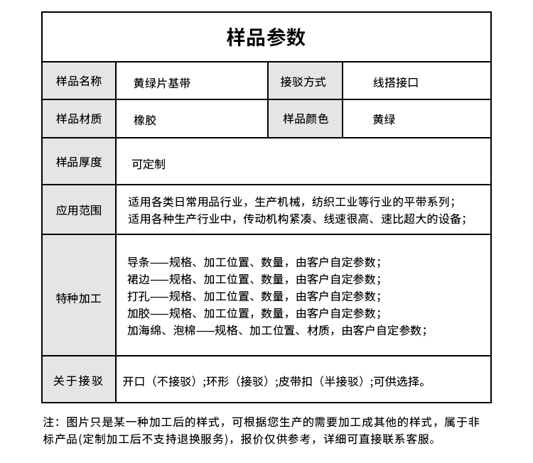 | 樣品名稱 | 黃綠片基帶 | 加工方式 | 線搭接口 |