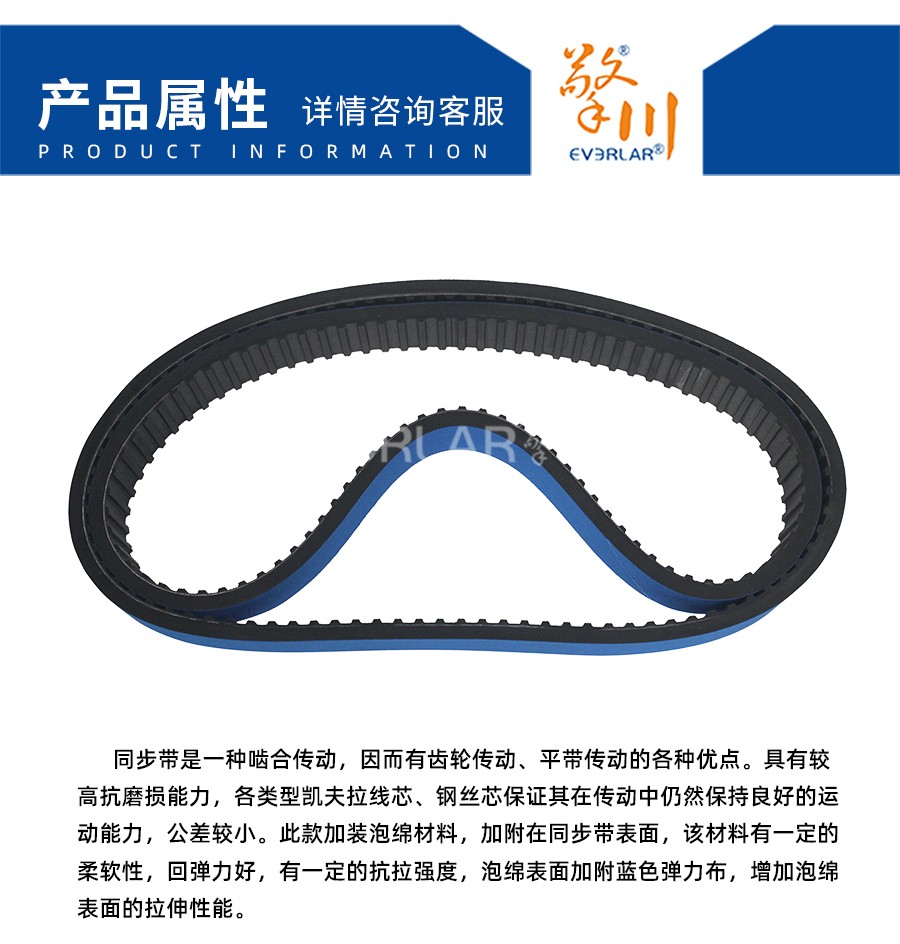 產(chǎn)品名稱:擎川everlar定制橡膠同步帶加藍(lán)色泡棉夾瓶機(jī)貼標(biāo)機(jī)傳動(dòng)帶