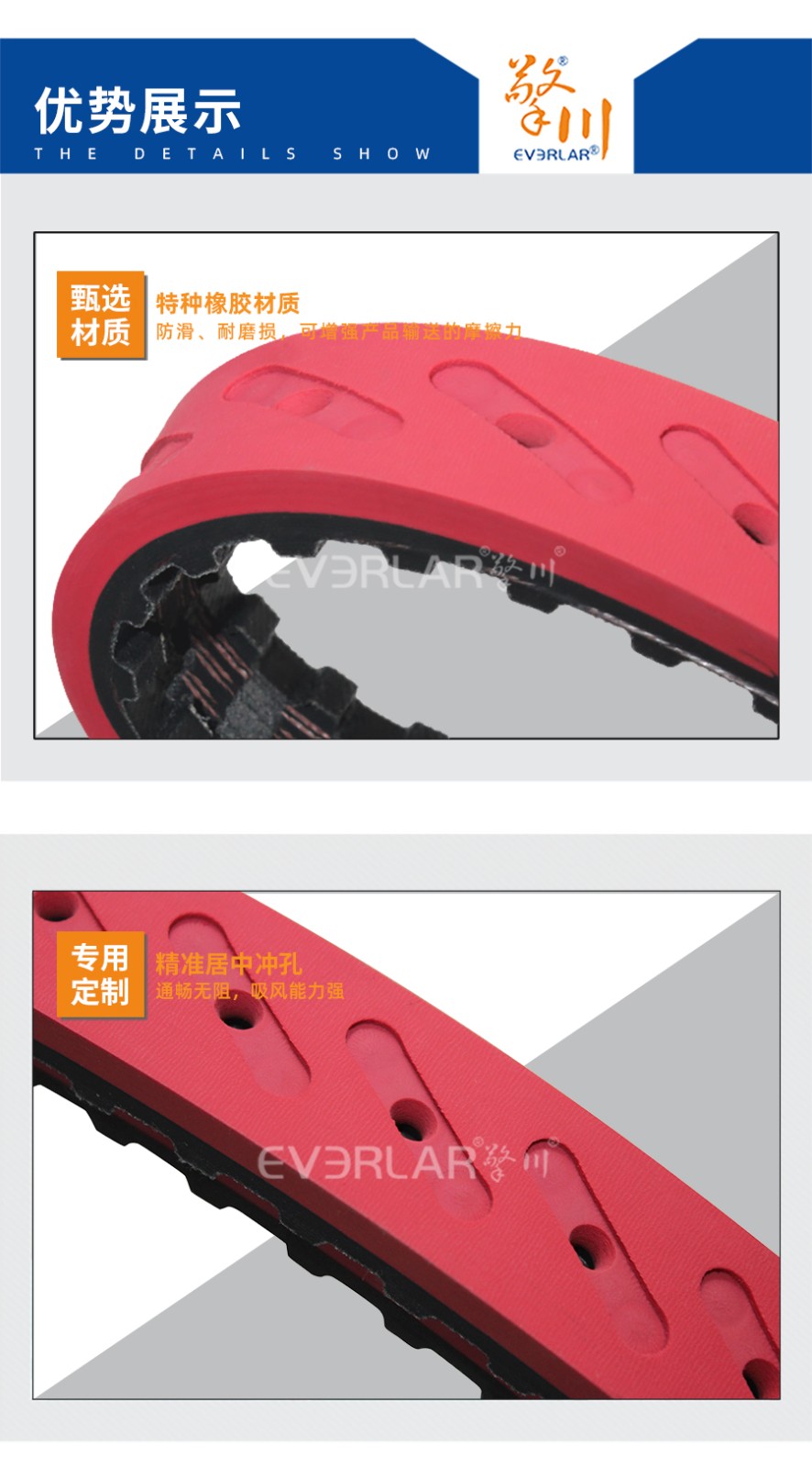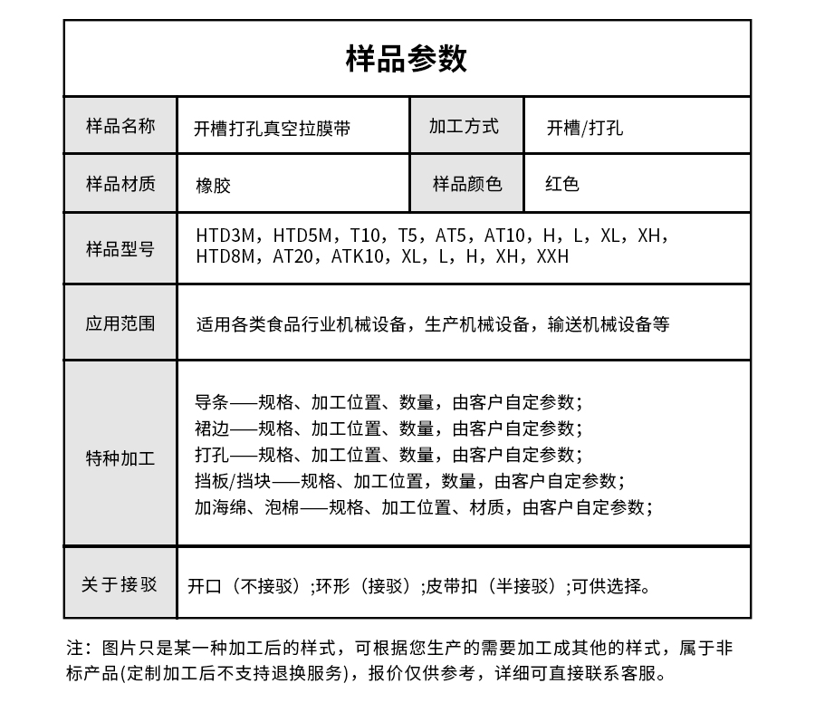 • 產(chǎn)品名稱:擎川everlar定制真空拉膜帶開槽打孔橡膠同步帶