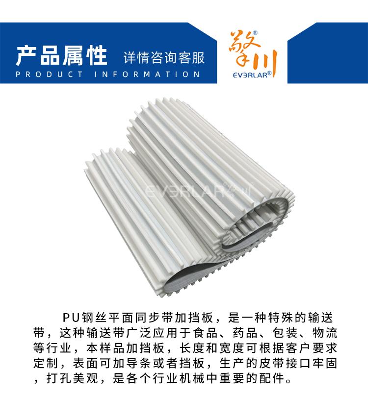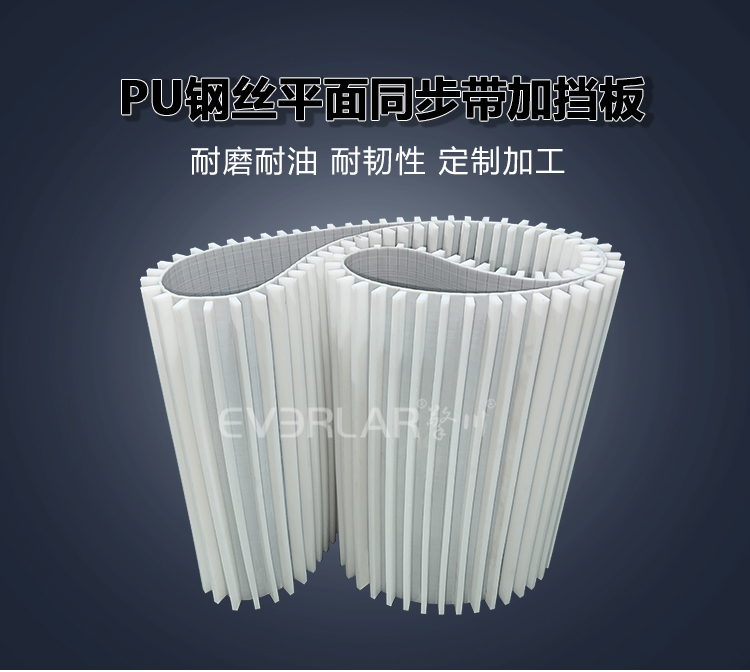 • 產(chǎn)品名稱:白色聚氨酯鋼絲平面同步帶加擋板物流包裝耐磨耐油PU傳動帶工業(yè)皮帶