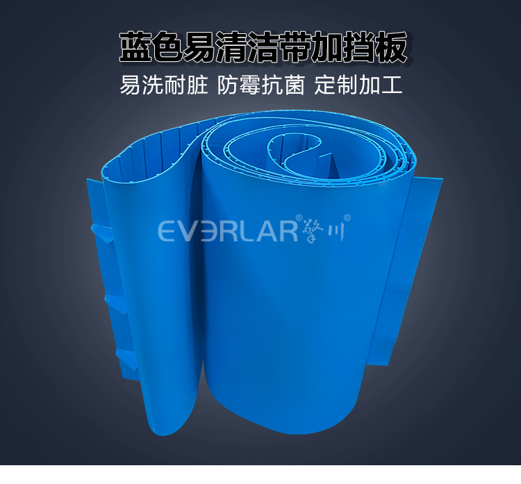 為食品、醫(yī)藥、包裝、日化提供一站式特殊定制藍色易潔帶加擋板:食品級輸送帶防溢抗污肉類廠